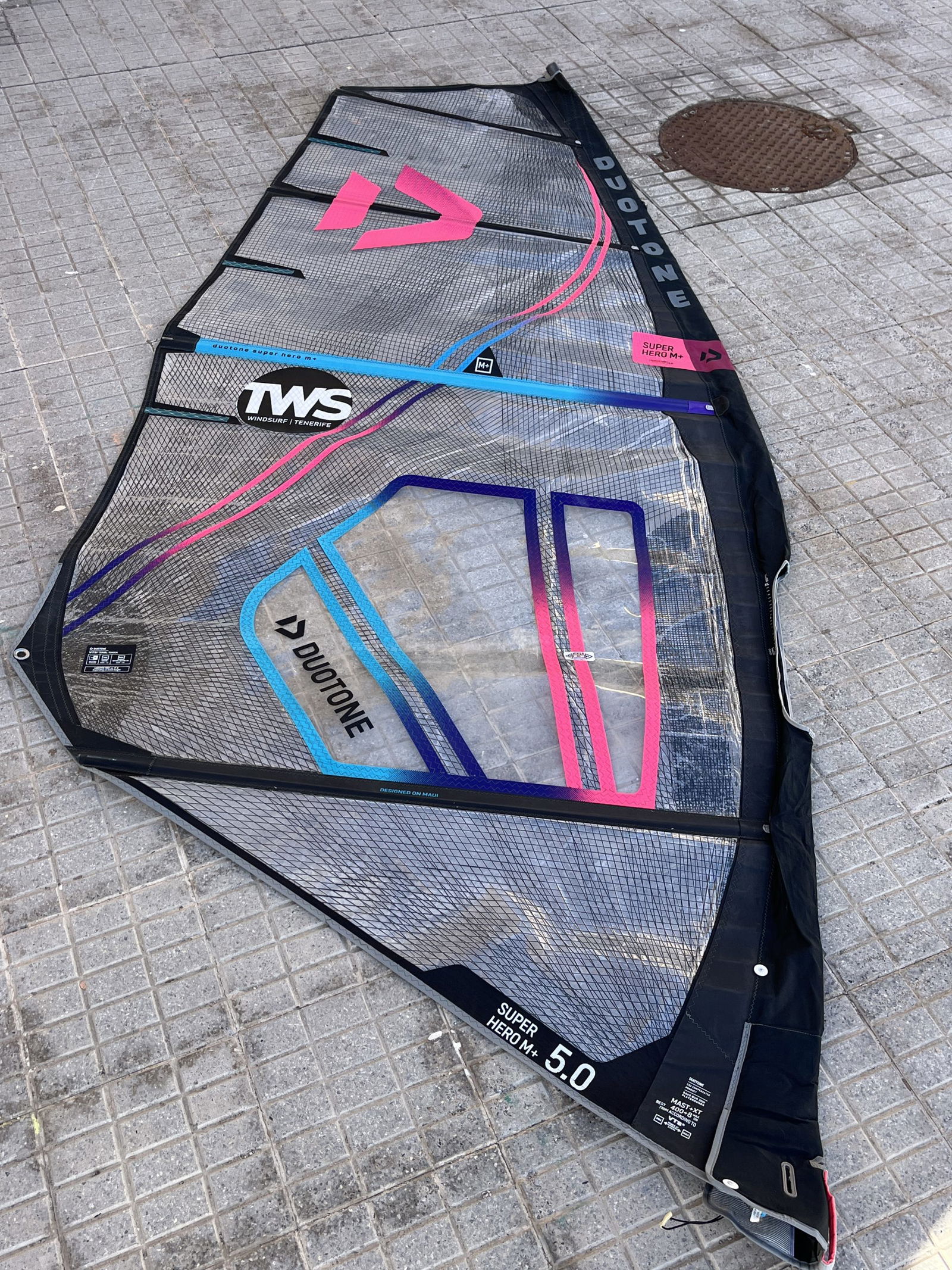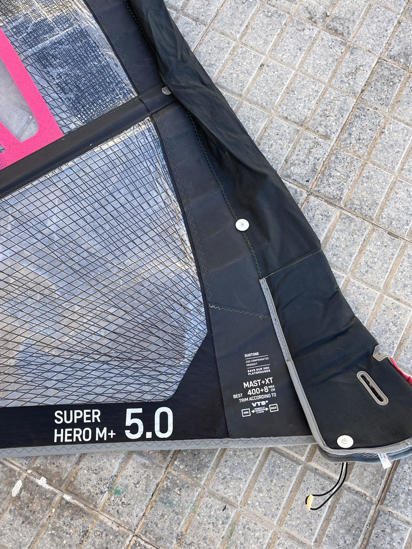 The Duotone Superhero M+ 5.0 2022 is a wave windsurf sail, designed for riders who want extra low-end power and stability while maintaining the well-known Super Hero control and neutral feel. The M+ version features a slightly deeper profile, offering earlier planing and additional drive, making it especially suitable for marginal wind conditions or heavier riders. The sail is fully functional, shows visible signs of use, but still sails very well.