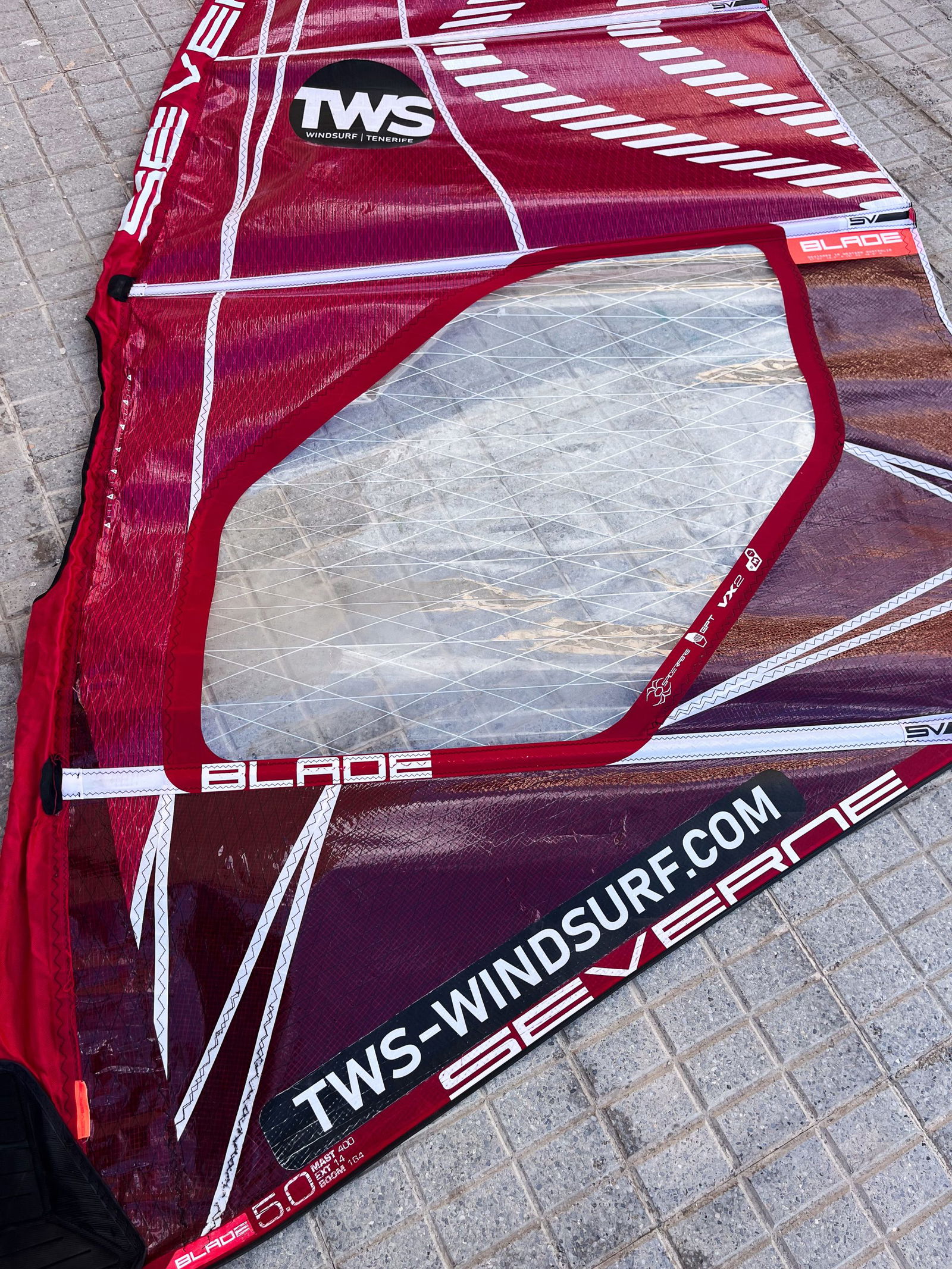 The Severne Blade 5.0 2023 is a high-performance, wave-oriented windsurfsail designed to deliver precise control, excellent responsiveness, and stability in challenging wind and wave conditions. The sail is in good condition and shows normal signs of use.